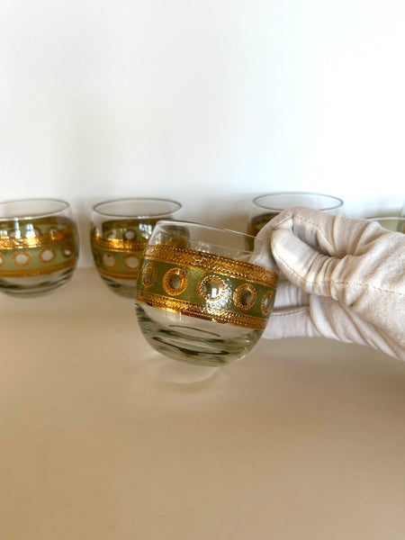 Condition: Very, very good vintage condition overall with minor general age. The green enamel is vibrant as is the gold. There is extremely minimal wear and a small amount of gold loss on one glass. Also, two of the glasses have small areas that feel like "braille" (very subtle and a common manufacturing occurrence with Mid Century glassware); it's very subtle but we like to be thorough when it comes to our vintage glassware. In short, this set is in good vintage condition and displays beautifully. Truly a stunning set that displays beautifully.