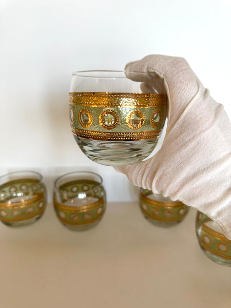 A stunning set of 6 Mid Century Polka Dot Green/Gold embossed glasses by Culver. These glasses feature a heavily embossed Polka Dot pattern against a vibrant green and are downright stunning. These glasses are a true clear glass with a very vibrant green and gold pattern; any yellow hue you see is from our camera's flash. Why not sip your cocktails/drinks from these stunning Mid Century roly poly glasses?! Cheers!