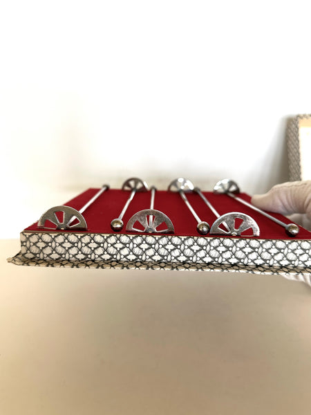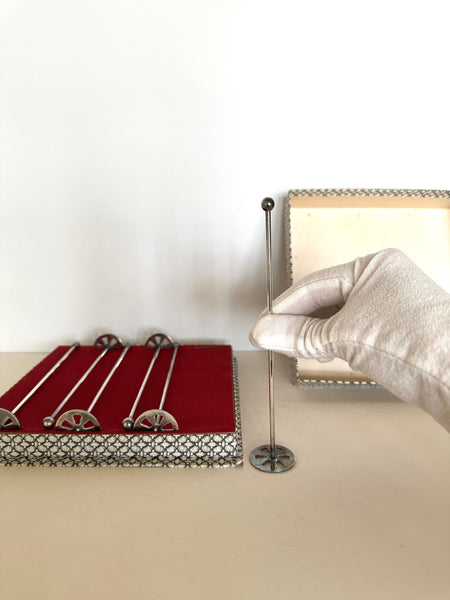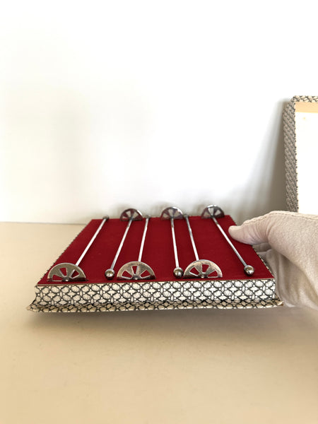 A lovely set of 8 Art Deco-esque silver-plated muddlers, 1940s, still in their original red velvet interior box. These silver-plated muddlers are simply lovely and feature a round muddler end (for muddling), with a cut-out pattern. The stems have a ball finial. These are well-crafted and have a weighted feel to them. The photos don't capture their magical factor. Truly a lovely set.