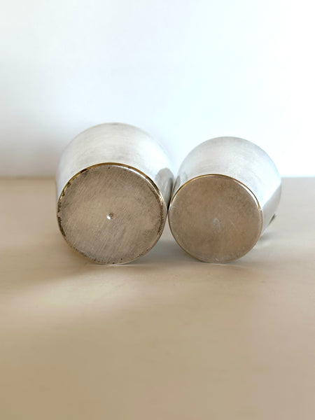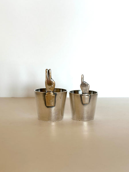 A pair of vintage one-finger and two-fingers jiggers, 1940s. Not unlike the Napier one and two finger jiggers, the one finger indicates 1 ounce, two fingers for 2 ounces. Each jigger is extremely heavy in weight and made of pewter. We took photos with the camera's flash as well as without the flash, to try and capture them. Truly a magical figural set.